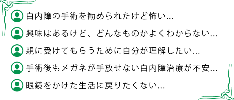 鈴木眼科グループの白内障老眼治療セミナーは、手術をお考えの患者様はもちろん、ご本人だけでなく周囲の方々からも理解と協力が得られるように、ご家族のご同伴もおすすめしています。